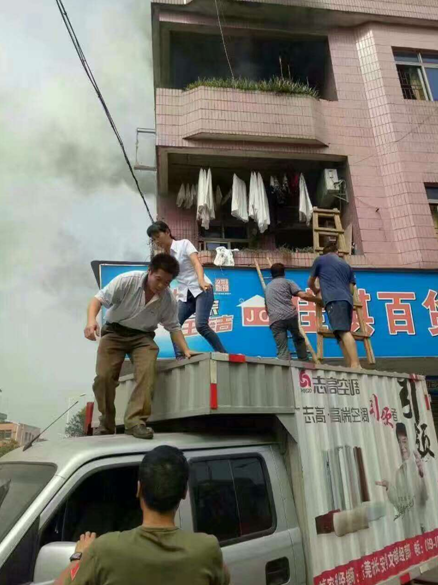 “空調(diào)哥”崔曉陽(yáng)將貨車開至樓下充當(dāng)“梯子”,有了服務(wù)車“墊腳”,熱心街坊扛著梯子迅速爬到車頂救人,大家一同引導(dǎo)、幫助二樓的被困人員順著樓梯爬到貨車頂部逃生。10來(lái)分鐘后,火災(zāi)被困的2名居民安全轉(zhuǎn)移到地面。隨后,大嶺山消防大隊(duì)趕到現(xiàn)場(chǎng),將剩余被困人員一一救出,撲滅明火。